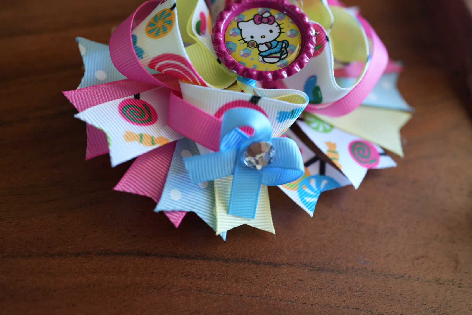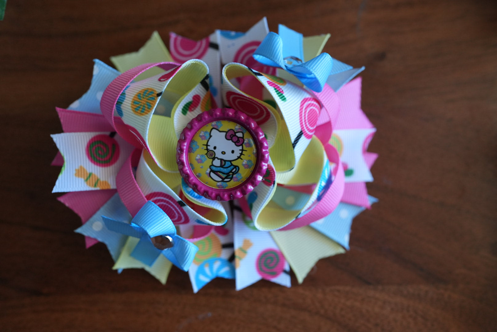 Add a charming touch to your little girl's outfit with our Kitty Boutique Hair Bow. Handmade from grosgrain ribbon, this well-made bow features a cute and unique kitty cartoon design with swirl candy lollipops print. Perfect for any occasion or everyday wear.Add a cute touch to your little girl's outfit with our Kitty Boutique Hair Bow. Handmade from grosgrain ribbon, this bow is well-made and features a charming kitty cartoon design with swirl candy lollipops print. Perfect for any occasion or everyday wear.